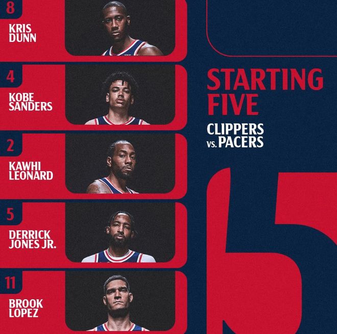 首發陣容方面,快船隊這邊,科林斯因傷缺戰,主帥泰倫盧排出的最新首發五人組為:克里斯-鄧恩、小德里克-瓊斯、科懷-倫納德、科比-桑德斯、布魯克-洛佩斯;步行者隊這邊,哈利伯頓早已賽季報銷,祖巴茨也不打,首發陣容為:內姆布哈德、內史密斯、沃克、西亞卡姆、杰-胡夫。