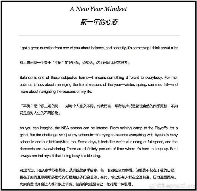 庫里還特意談到了平衡的話題。他說,平衡不是關于時間分配一樣多,而需要保持正確的視角(perspective)。 我沒怎么看懂什么是保持一種視角,他對于時間、平衡的理解應該跟我不太一樣。有沒有人分享下見解。