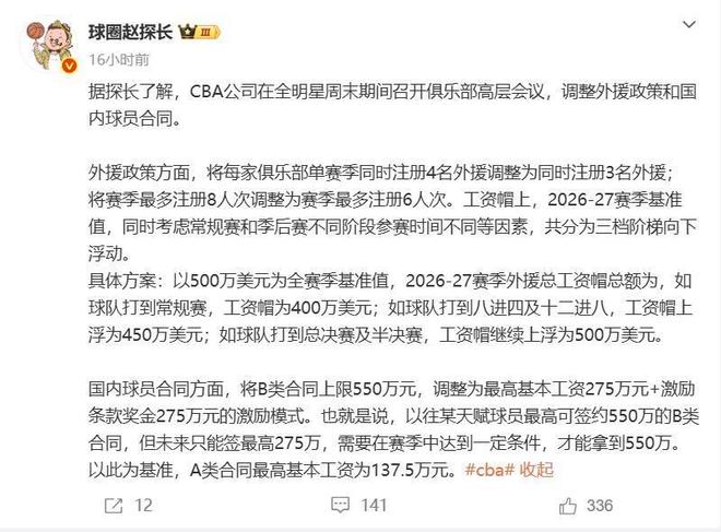 根據媒體人所講,CBA公司在全明星賽期間召開高層會議,下賽季每支球隊最多可以同時注冊3名外援(本賽季為4名),下賽季外援注冊人次調整為6人次(本賽季為8人次,上賽季沒有限制);另外關于外援工資帽的問題,只打常規賽的球隊外援工資帽是400萬美元,打到季后賽12強或者8強的球隊,外援工資帽是450萬美元,半決賽(四強)的球隊外援工資帽是500萬美元。
