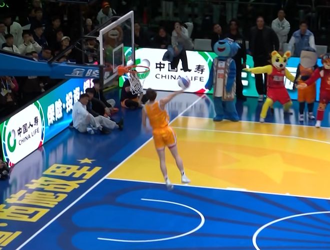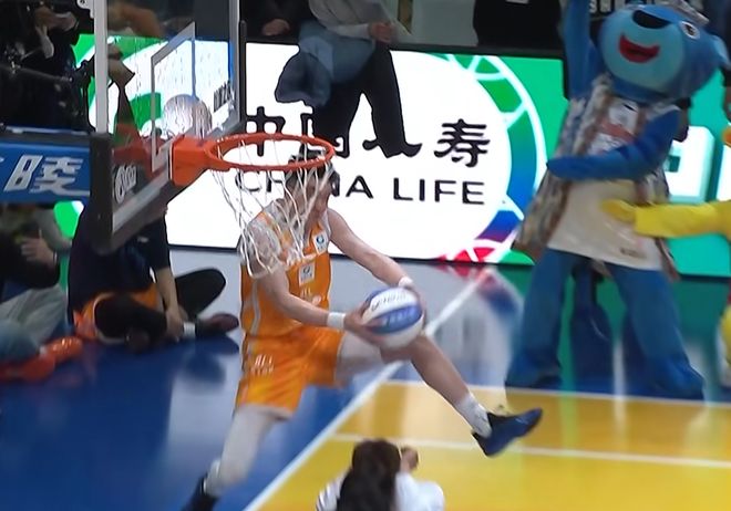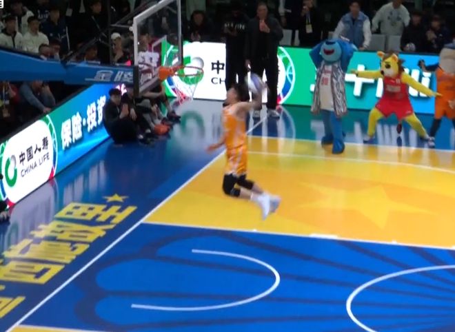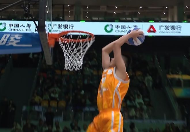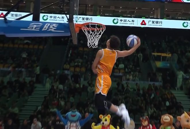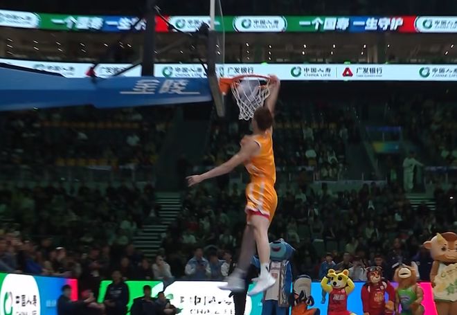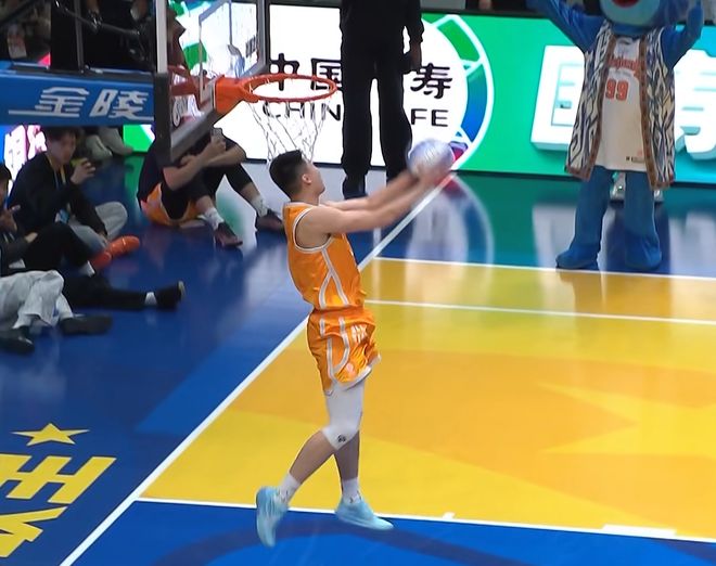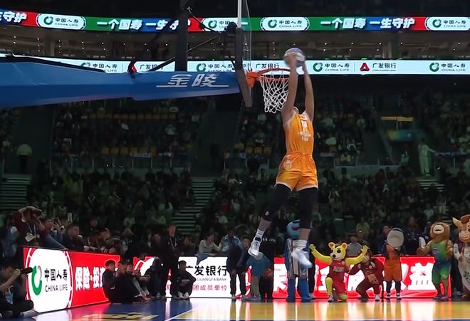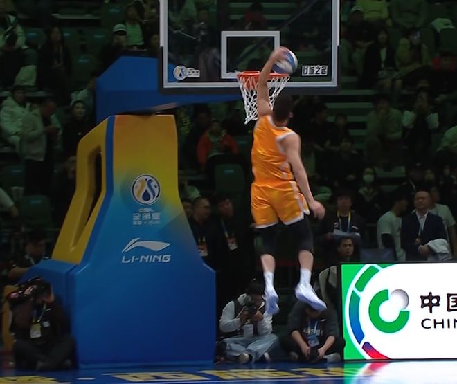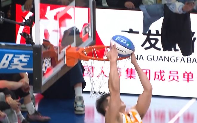 張文杰選擇籃下沖出來,大風車轉體暴扣,第一次失敗,第二次成功,獲得46分。