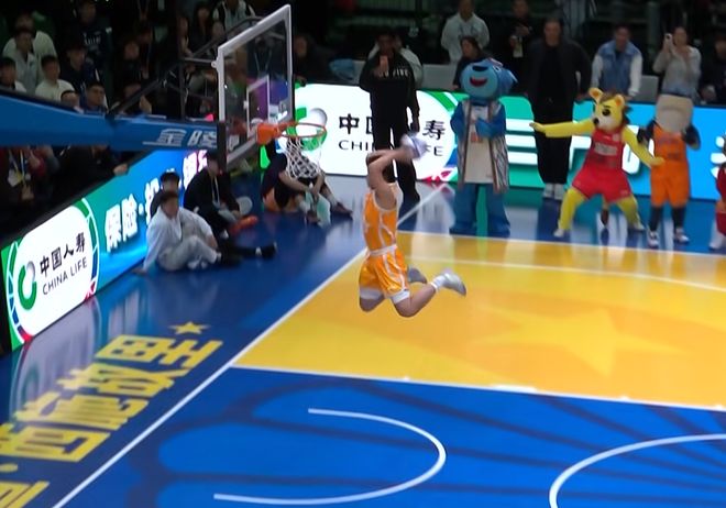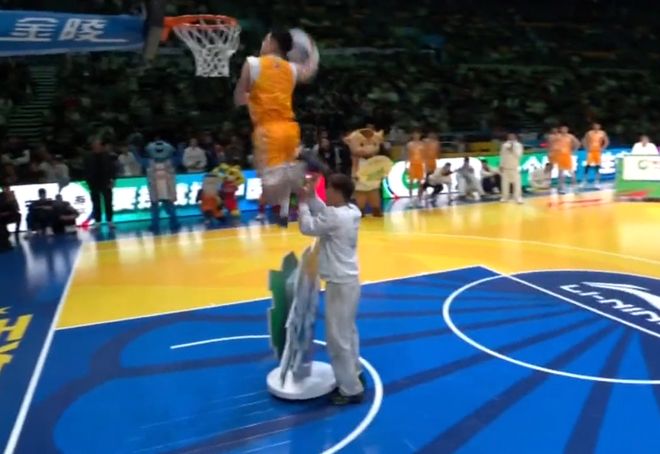 張鼎巖出場,工作人員頭頂拿球,張鼎巖飛躍并奪球完成風車扣籃,獲得50分。